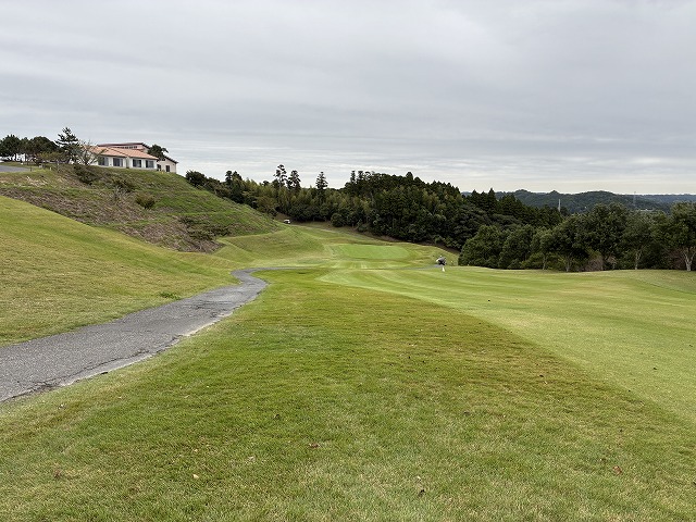 9番は508ヤードの左ドックレッグのロングホール。1打目はフェアウェー左側が狙い目。2打目地点から打ち上げになっている。3打目以降、グリーン面が見えない。