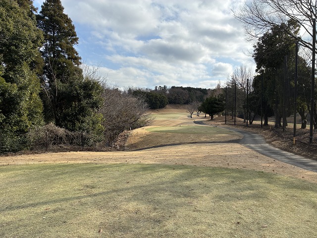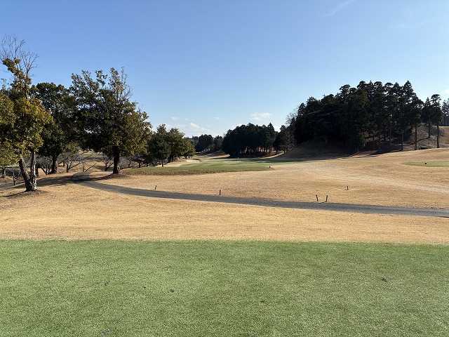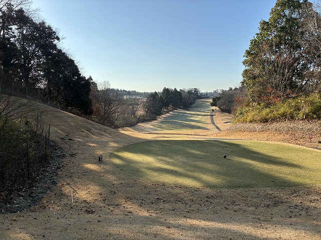 9番は324ヤードと距離の短い、右ドックレッグのミドルホール。フェアウェー左側にOBがあるので、1打目はバンカー上のフェアウェー右側が狙い目。