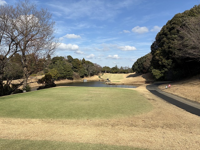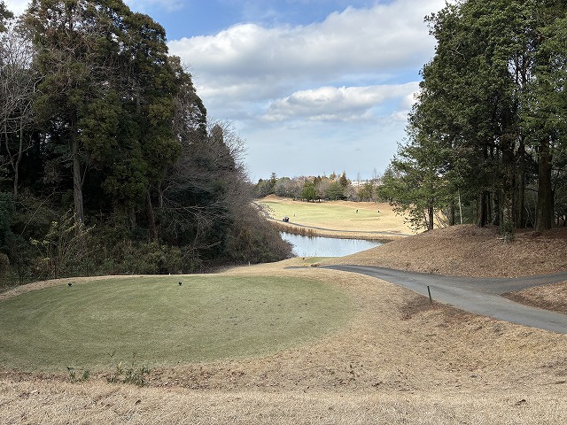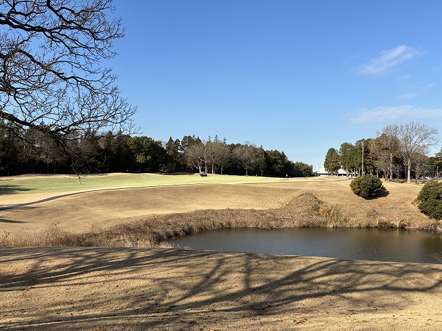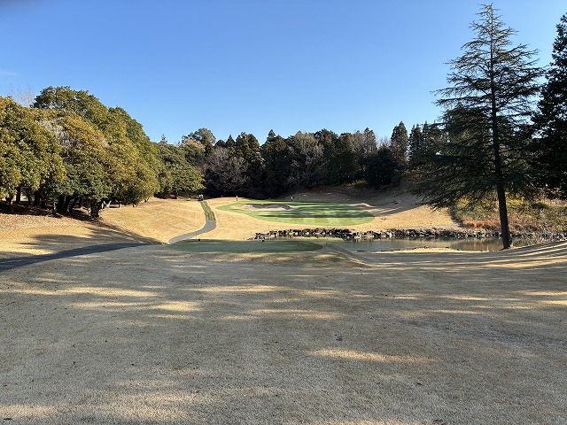 5番は326ヤードの右ドックレッグの池越えのミドルホール。フェアウェー両側に1ぺナがあるので、1打目はフェアウェー右側が狙い目。