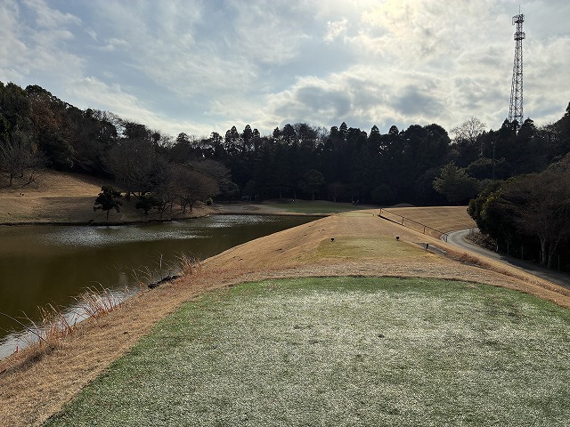 1番は389ヤードのミドルホール。ティーショットは、フェアウェーセンター右サイドに池があるので、フェアウェー左側が狙い目。